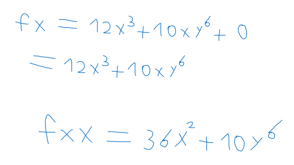 أما التالية : \[ (5x^2 y^6) \] فتم إشتقاق الإكس وابقاء الواي موجودة لأنه هناك بينهم علاقة ضرب مع الإكس ولسنا قادرين على محوها في الإشتقاق جزئي الأول