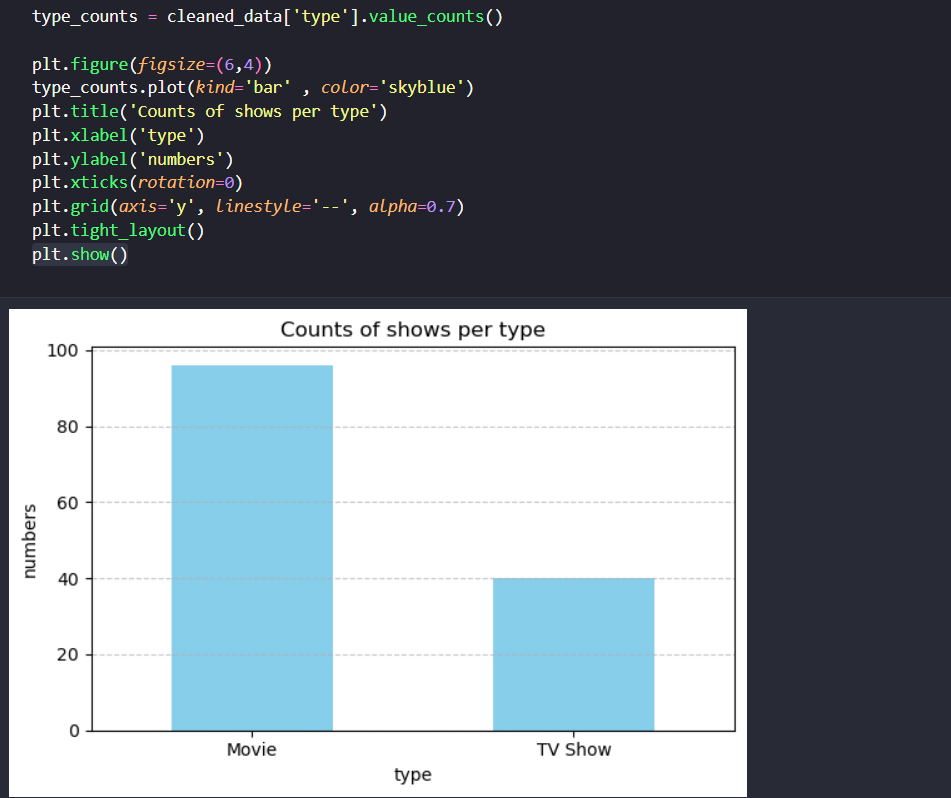 ثم هذا الأمر بعد الأمر السابق : plt.title('Counts of shows per type') وهو عنوان الرسم البياني الذي تريده ببساطة .