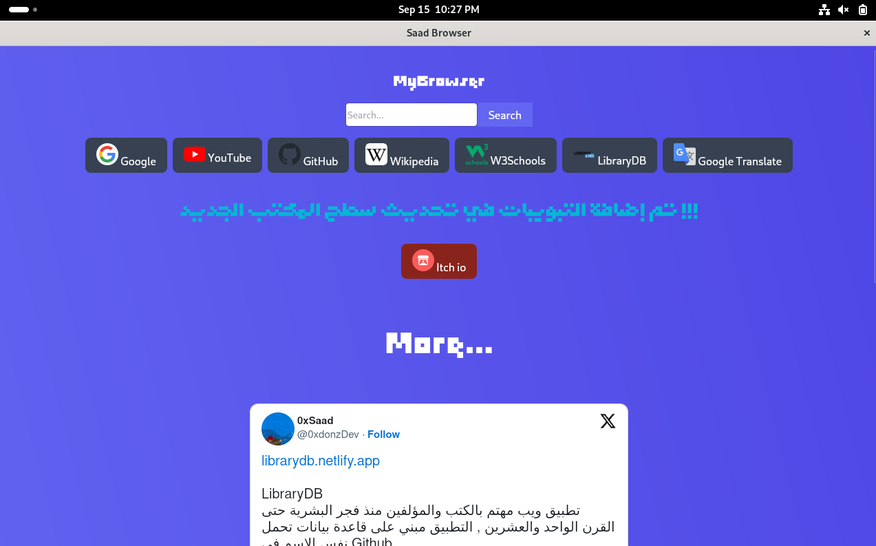 - SaadOS : توزيعتي الخاصة المستقلة , مع متصفحي الخاص وألعابي الخاصة بإذن الله ستصدر قريباً وتنال على رضاكم وإستحسناكم . وهي في الأساس توزيعة شخصية في المقام الأول وليس للإستخدام العام أو التجاري.